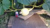 Day 13 on the 2059 Daletas. 16" Circumference. Unfortunately some critter scratched the top of it a few days ago. That is going to be one big ugly gash by the time the pumpkin is done growing but there is not much I can do about it because this is the only fruit growing on the plant.