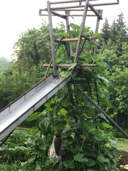 Andy's long gourd trellis is filling up fast. The soil is jacked under that slide. I am going out on a limb and saying a very long gourd is gonna come from this spot.