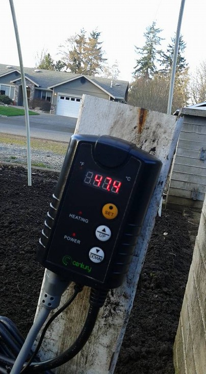 The new soil heating cable doesn't have a built in thermostat so I had to get this one. The nice thing is that it also gives a reading of the actual soil temperature. I have a ways to go to get this up to temp.