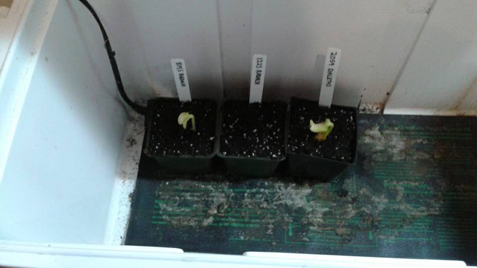 Succesful Germination. The 2059 Daletas and 819.5 Radach are out of the ground. It's hard to tell in the photo but the 1223 is mounding up the dirt and should be poking through soon.