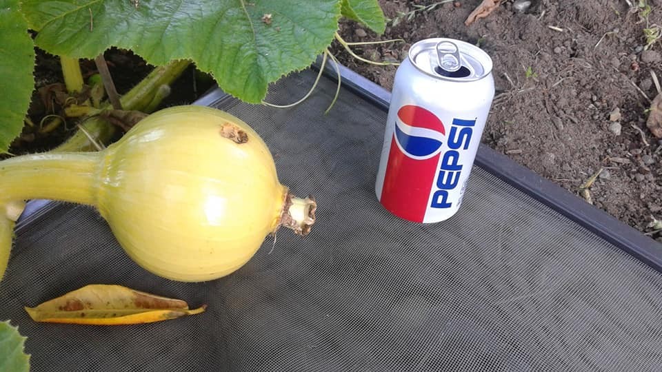 Day 13 on the 2059 Daletas. 16" Circumference. Unfortunately some critter scratched the top of it a few days ago. That is going to be one big ugly gash by the time the pumpkin is done growing but there is not much I can do about it because this is the only fruit growing on the plant.