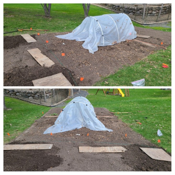 2021 amendment day. Had some issues getting the tiller going, but managed to get the job done. Coils in, hoop up. 150 patch marked out. The patch is 160" wide. Flags mark out 135" length for 150 sq ft. Not visible in the pictures are a set of four pop crates that have been sunk in the garden to mark the corners of the boundary that will be a seasonal addition.