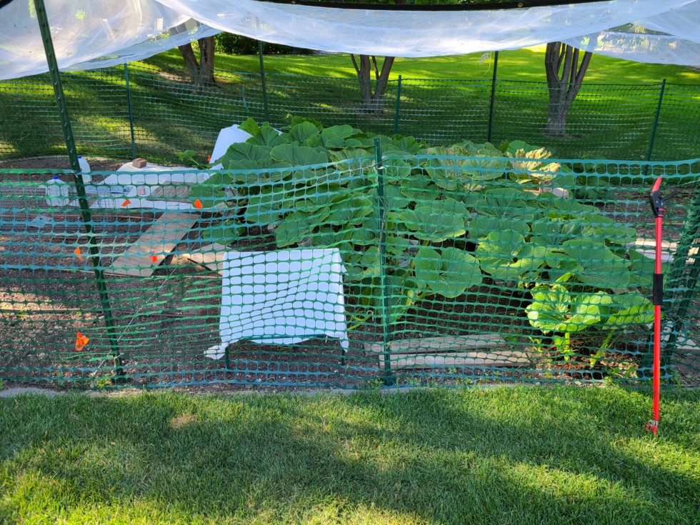 150 contest update. The extreme early season heat + animals have eliminated some of my options. There's one last female flower on the true main (4 lober, opened 6/13). A secondary has taken over as the main from the same node as the female, which could be used as a new main but will be removed if the pollination sticks. There have been a number of females on secondary vines, all of which have aborted so far. There is one that may be developing, covered by the tent nearer the camera, which could be an option in the area of the patch where the secondary vines were prematurely terminated by the wildlife. Mill cloth was set down to accommodate the preferred flower, but extended beyond the pre-determined growing area (by 32"X60"). New markers + white twine denote new boundary that accommodates the mill cloth, where 19"X100" of unused area is excluded.