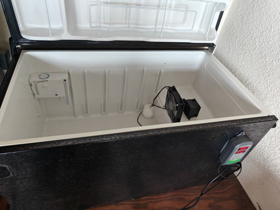 New Seed Sauna�, replacing the Seed Hot Tub�. Got a broken mini fridge for $5, drained refrigerant and routed my cables, 200 watt AC ptc heater and an AC circulation fan. The 200 watt heater heats it up really fast, but it has a small heat sink and isn't so powerful as to strong arm the temperature above the set point. First heating cycle it goes over by 4f, then it settles in on the set temperature very steadily. Seems to hold heat pretty well, the heater only turns on for 10-20 seconds every 10 minutes or so.