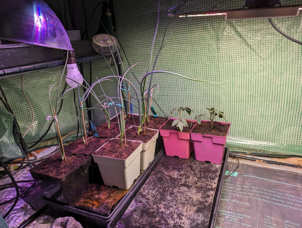Giant onions and mystery tomatoes after uppotting into 1/2 gallon pots. Have a few aisla craig and glazebrook variety giant onions for the two different types we're growing this year.
