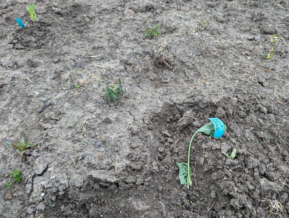 This is a new one for us. Guessing a rabbit decided to sample the brassicas. Giant kohlrabi and cabbage took a hit of varying degrees. These two kohlrabi suffered the most damage. This one was taken down to ground level, don't know what it will do even if something sprouts back from the leaf nodes. The one in the upper left at least still has the grow tip so think it will recover even though it will be set back quite a bit.