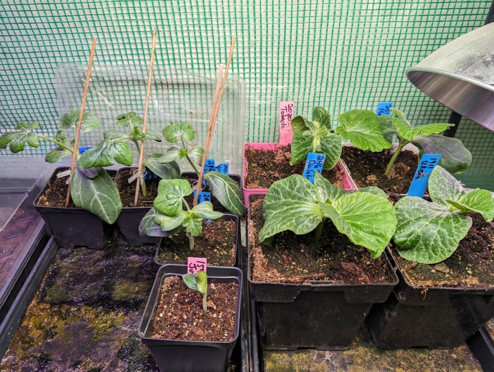 First round of watermelons are out of the healing chamber. This group has the 299 Dawson, 341.5 Vial, 210.5 Zappa. and our 202.5 from last year. Half are on bottle gourd rootstock and the other half are on bushel gourd. The AG's are looking good after being up for a couple of days, and the 159 Jutras long gourd has joined the party.
