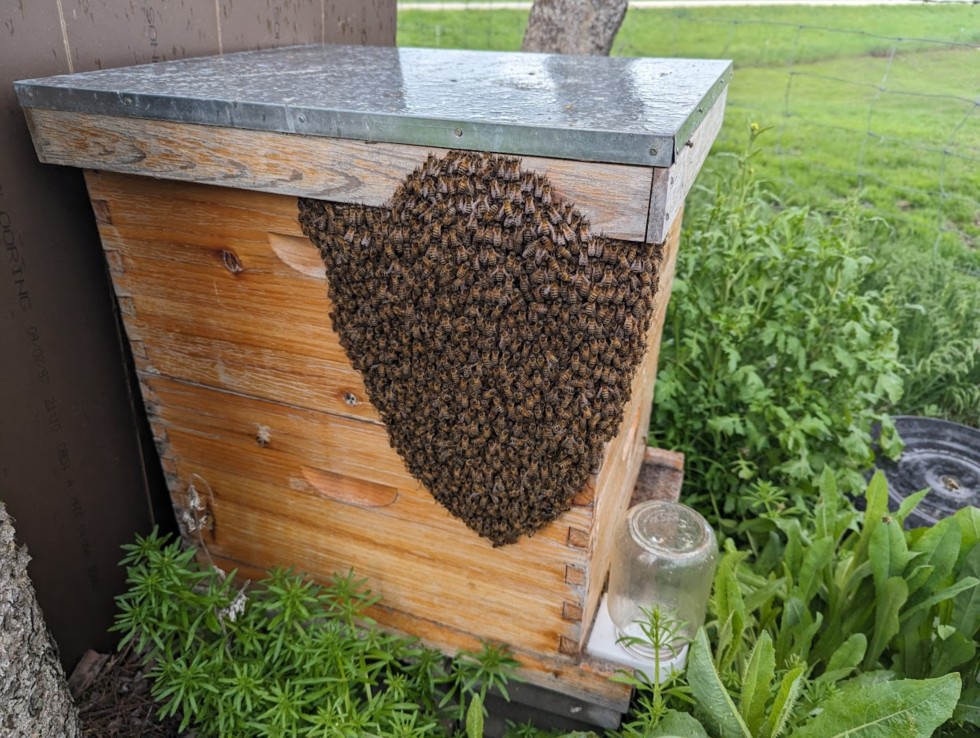Had a text from the neighbor this morning where we keep one of our hives asking why the bees were grouped up on the outside. Filled up the box a little quicker than I anticipated this spring. First time I've had a swarm actually stay on the box though instead of a nearby tree. Made collection easy and they have now been moved to their new home.