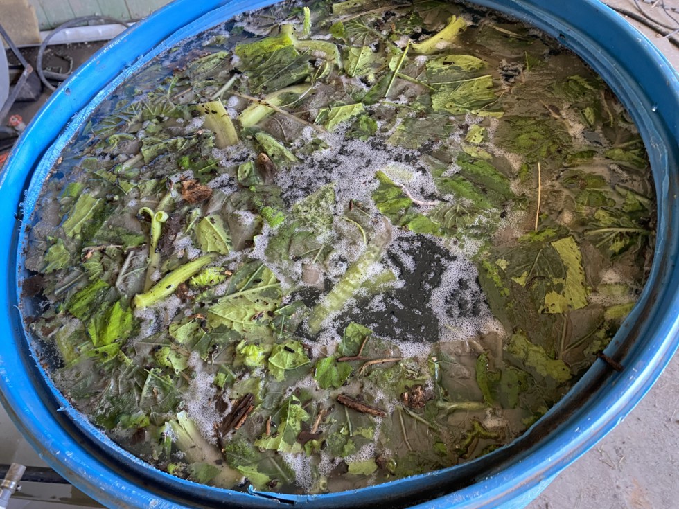 This is the JMS we make with soil sea salt and pumpkin leaves which we pump through the drip lines. The leaves are to grow plant pacific microbes. With the water at 80 degrees it takes 24 to 36 hours to make.