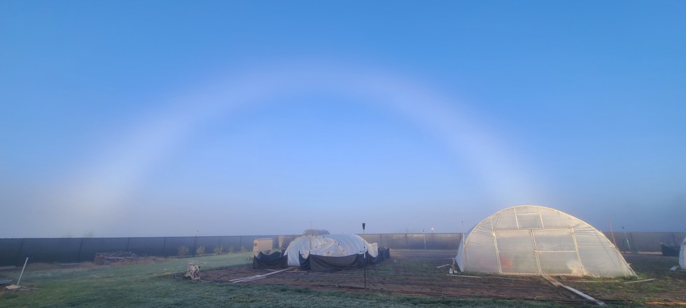 Got down to 29 degrees last night. Took these photos of a "Frost Rainbow" at 5:40 this morning that had formed over our patch.