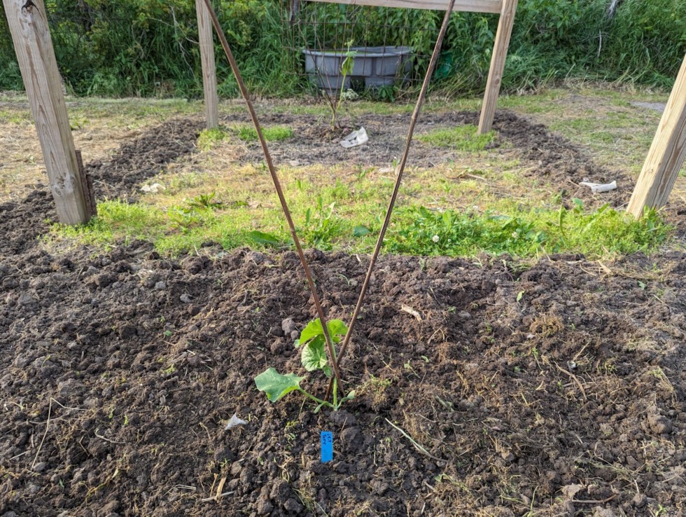 Growing three cantaloupe this year. Trying something different by growing one under the long gourd trellis. Seeing if the shade might extend growing days, but most likely won't have an effect. Pictured is the 64.7 Terry. In the background is the 159 Jutras long gourd. This has been a good aggressive plant up to this point but something doesn't look right with it at the moment. Bottom leaves seem to be crisping up and top ones are spotting. Sprayed this plant with the same stuff as the others the day of the beetle attack. Wouldn't think that is the cause as none of the other plants that were sprayed with that insecticide are showing any ill effects.