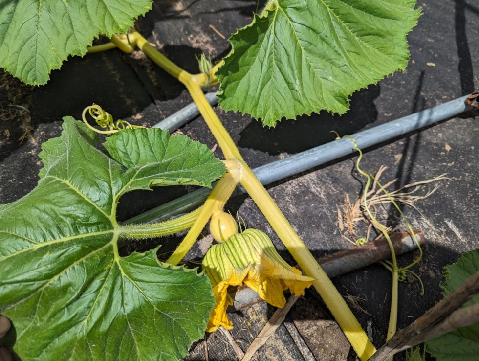Not the best looking blossom and a little funky with the vine attached to the stem of the pumpkin. It was also facing a little downward as opposed to being straight up like they normally are. There's another blossom at 18' that will be ready in a few days if this one doesn't turn out.
