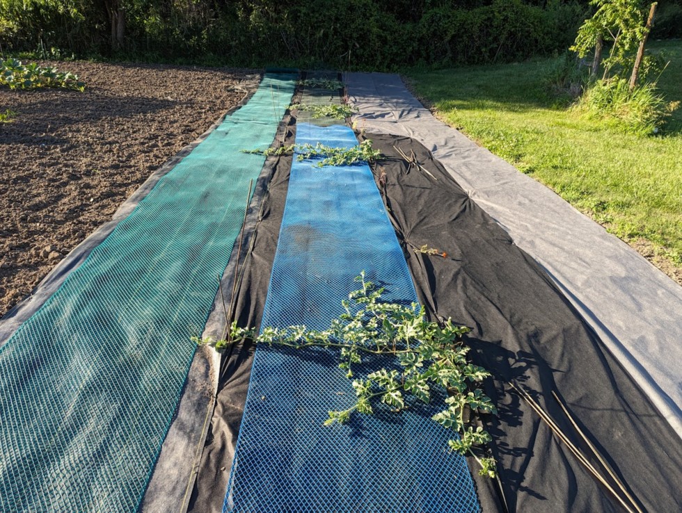 Same for the second melon plot. Some marigold and nasturium plants were added between melons as an attempt to reduce pests