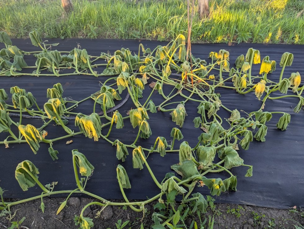 100 Ciesielski AG x Red Kuri collapsing. Noticed a little leaf droop on this plant yesterday but looked good again this morning. By evening looks like it's done. No noticeable disease on leaves and don't see any insect damage around the crown/vines so not sure what happened. Seeing a couple drooping leaves on the 130 Soner Boner AG x Butternut so it's most likely heading for the same fate. Guessing it's root related with total sudden collapse unless it's spray drift from neighbor's bean field. Other garden plants in the vicinity don't seem affected if it's spray drift though.