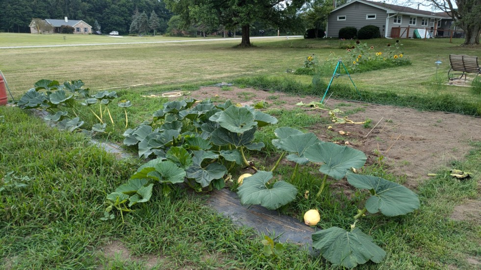 2054 Strickler also developed YVD, or what I can assume is YVD since I don't have a tissue test to prove it. I was going to pull the entire plant, but these three vines had not yet been visually effected. Since I'm still fairly inexperienced I've decided to take this opportunity to see how this disease progresses. By removing all the infected vines I may able to tell whether or not the plant can still support fruit, or if the disease infects the vines long before they start to appear yellow. Any fruits I had on the other vines went rotten in a hurry. These two haven't aborted yet. Also you can see I missed a tertiary in my pruning. We'll just let that grow now..haha. Apologize for the weeds/crabgrass. It's been hot/rainy and I'm probably just going to spray the majority of that stuff.