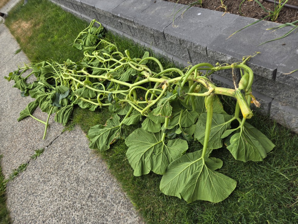 21 days after pollination which the aborting period is over! This pumpkin should be safe now. cut the main Vine past the fruit. It was about 12' long. Spraying the under side of the Leafs with water not only helps git rid of aphids, it soaks the nutirents down into the root system.