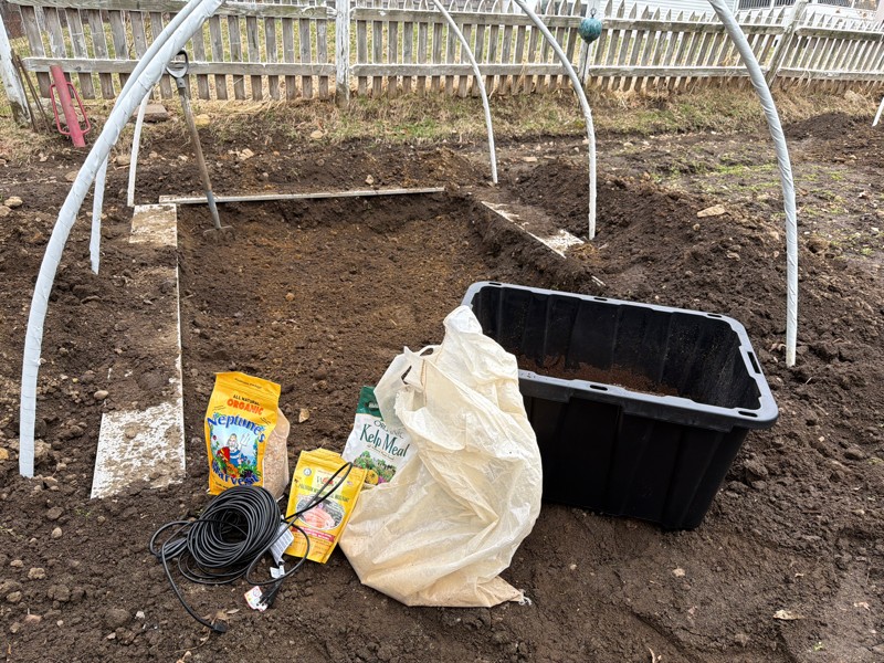 Today's project. Working on hoop house number 1 with putting in the heating cables and the good stuff! Hoop house number two will have to wait till that big boulder gets out next week!