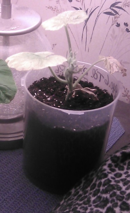 Here she is, Miss Pum..., ah, well, it is doing well from just two days ago and I've added the 24-8-16, as promised. >>>Off-camera, it is doing even better! I can't wait to see its result(s) with the tough life it has had, thus far even entailing a mini, main vine starting, as any other seedling. It is essentially 'MYCO/HYDRO/AGRO' pumpkin-growing! Excited, too, that my other castaways are getting the fert as well...eg