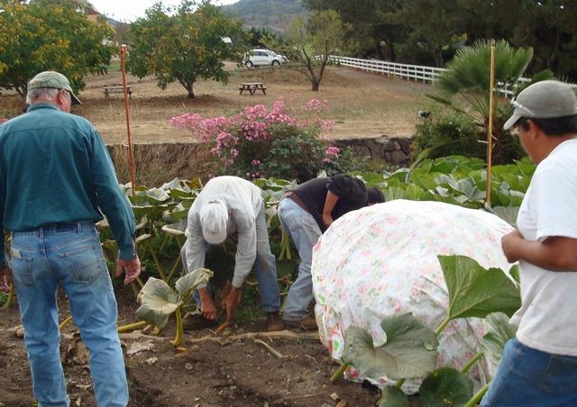 The next 14 photos show the loading of the 1535.5 Glasier........Pete Glasier clears away the leaves on the 1092 Martin plant which is growing his 1535.5 pumpkin. Gary Miller (on the left) arrives to help.