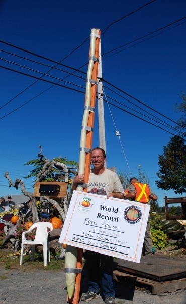 BigPumpkins.com congratulates Fred Ansems on his 139.25 inch long gourd measureed at the AVGVG Glad Garden's weigh-off in Kentville, Nova Scotia. Fred grew his record long gourd on the 120 Kline seed and crossed it with the 123 Rumancik.