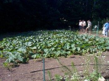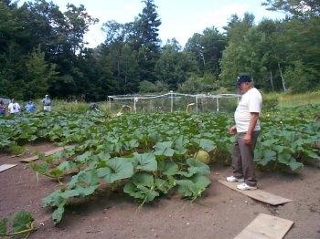 The second stop of the N.H.G.P.G.A. patch tour was at Jim Kuhn's house in Goffstown, NH. Jim is the current New England champion having grown a 929.2 pound pumpkin in 1997. This is a shot of Jim with his 801.5 Stelts plant. The 801.5 comes from the 825.5 Shymanski 1996 crossed with the 562 Rose 1995. This is a very popular seed this year and is therefore very hard to get your hands on!