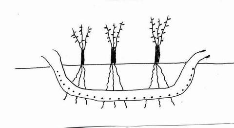 While you are hardening off your seedlings you need to lay out your watering system. What you will do is dig a trench under where you will plant your tomatoes about 12" making sure the trench is completely level (this is very important). Now in this trench you will lay drainage tubing (4" diameter) and on both ends of the tube it will stick up out of the ground making sure most of the holes point down (see diagram).