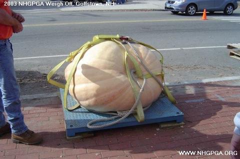 538Beauchemin on the scales at NH State Weigh off, Oct. 18th, 2003. Pumpkin was sound and weighed on official scales.