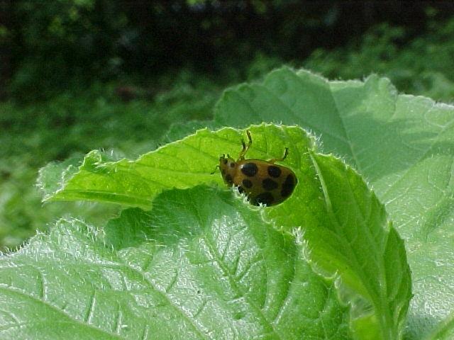 I BELIVE THIS IS A SPEADER OF MOSAIC VIRUS..AKA CUCUMBER BEETLE,,AKA,,,"PRETTY LADYBUG!",,,LOL,,,SMUSH! 9RUB SOIL ON FINGER AND WASH WELL,AND DRY.