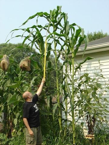 Picture of me holding a 6 ft. pole. I'm around 6'3 1/2" tall. I reach about 8 ft. standing. Corn was over 14 ft, but it all blew over during the wind storm we had tonight, except for the shorter one.