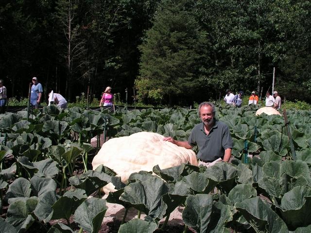 Steve Sperry with his largest pumpkin so far this year. It was grown on the 1253 Sperry 2004 and crossed with the 1068 Wallace. Like most of the pumpkins on the SNGPG tour, this one is somewhere over 800 pounds.