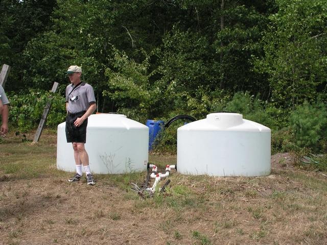 Joe Jutras has two large water tanks here in the upper portion of his backyard. Steve Connolly of Massachusetts was caught in the shot. Steve was the first grower to weigh a pumpkin over 1000 pounds at Topsfield (his weighed 1009.6 back in 2000).