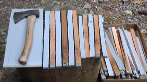 Since 1984 I have made stakes for anchoring runners from old Cedar Shingles or Cedar Shakes. They last for many years. I have two 55 gallon barrels full of them that were saved at the end of last season. The longer ones are 14" and are used innially to keep the wind from whipping plants around. The short ones are 10" long and used to stake runners about every 2 feet. I split them with a hatchet with an aim width of 3/4 inches.