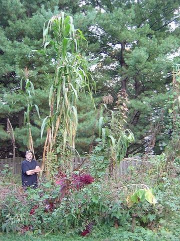 This is a picture of some olotillo blanco maize. It's not the tallest I've ever had, but it's definitely a great variety to grow for height. This small patch made it through all the wind because I used tree velcro tape to group them together. You can see an another large variety of amaranth growing to the right. It's leaning over, but still is standing on it's own. It's starting to flower; so I hope to get some seeds from this variety too. If you look closely, you can also see one growing up through the middle of the corn. This variety of amaranth was planted late, but it still managed to get very tall. It's not as tall as the giant amaranth, but it's much bigger than most amaranth varities.