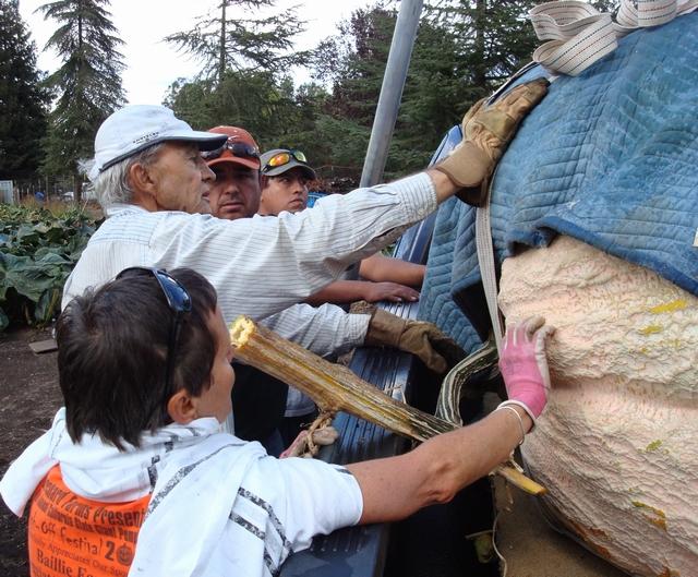 Cindi, Pete and Jose are making sure that the pumpkin is positioned so that the sidewall of the truck does not break the vine or stem.
