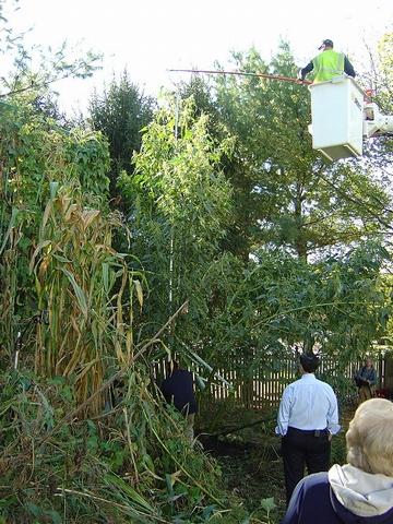 The County Weights and Measures came to measure my plant. Measured 23 ft. 2 in. This is the same measurement I made; so I was happy that they came up with the same number. I almost lost the plant this weekend because of strong wind. We had wind gusts up to 45 mph. I lost many side branches, but I was able to keep the plant standing with velcro taping it to all the other plants for stability. As you can see from the pic, the other plants didn't do as well. I had a flag pole fastened to the tallest, and that kept it from bending over during the heavy winds.