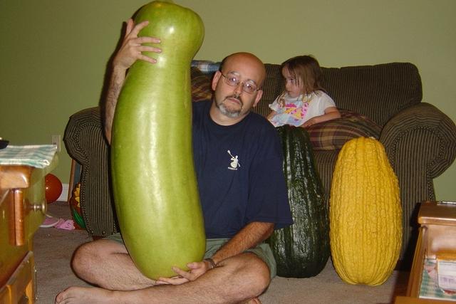 Picture of a zucca gourd and a green and yellow vegetable marrows.