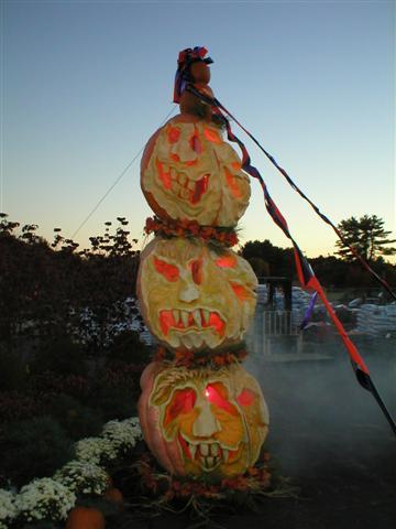 Carved Giant Pumpkin Totem Pole by Scott Cully.