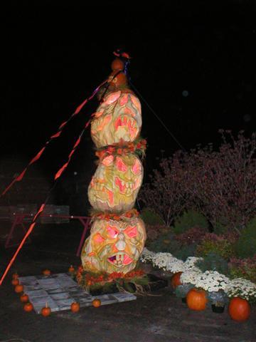 Carved Giant Pumpkin Totem Pole by Scott Cully.