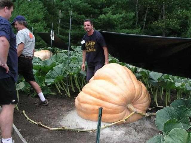Fred Macari is pictured here with his biggest pumpkin. It is growing on his 1173 Macari seed. This pumpkin is really high. It has a coule of deep ribs that Fred is keeping his eye on.