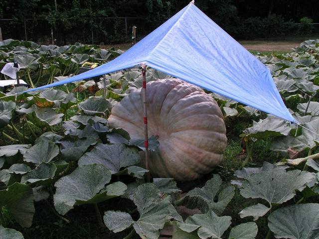 John Nicholas and Ron Wallace have this pumpkin estimated at 750 pounds growing on a 961 Wallace seed.