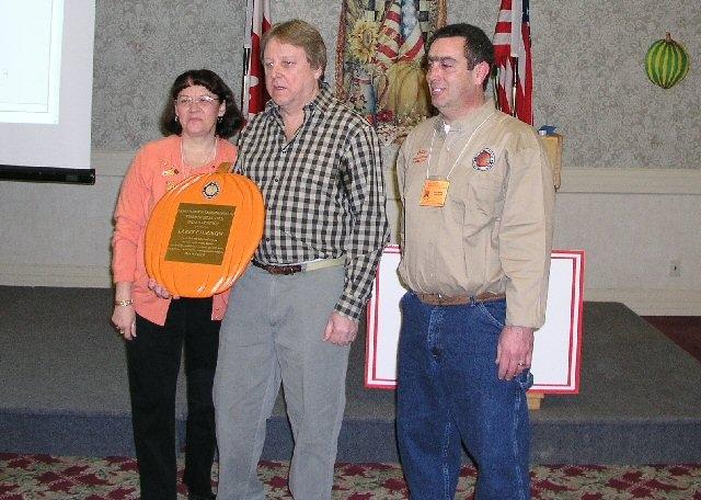 Dave Stelts presented Larry and Gerry Checkon with an award from the GPC for the biggest pumpkin in 2005. Larry's 1469 pound pumpkin is also the current world record!