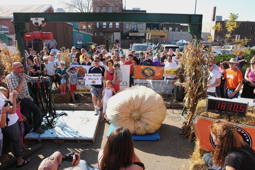 An overhead shot of the massive pumpkin. Spectators roared and squeezed in for an opportunity to see history in the making.
