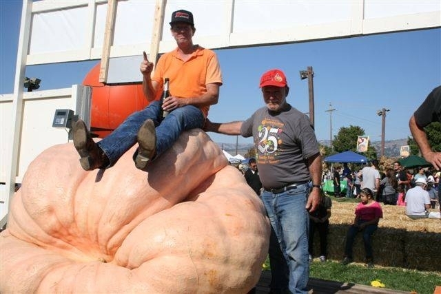 Tim Mathison having a seat on his 2,032 pound World Record giant pumpkin!
