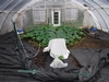 Here is a different view of the pumpkin, fan and sonicator set-up. The main vine has a slight bend to it, but a few nodes down is the back-up so this bend should be sufficient to keep it away from the pumpkin. Also, since everything is on the double layer of mill fabric adjustments will hopefully be easy to make as the season progresses if necessary.