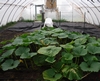 This shows what the plant looks like and early secondary vines will be terminated soon. Two "Henry Fans" (carpet/floor fans that were recommended by "Henry-the giant pumpkin grower" here in bigpumpkins.com) have been added to help keep air moving inside the structure. There is also CO2 being added so these fans help ensure an even mixing of CO2 and temperature in the growing area. These are only run during the day when air circulation is needed the most