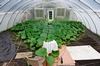 Here the end that is lifted can be seen in better detail. The actual plant may seem a bit foggy, and this is because there is insect netting behind the plastic so when it is lifted there is still a physical screen in place. This allows air to come in, but limits the chance that unwanted insects can enter. To help this air flow process a blue "Henry" (Carpet) Fan can be seen. This will help direct outside air into the hoop house and under the leaf canopy.