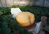 This shows the plant and set-up from a wider angle. Under the chair with the white sheet is the pumpkin with the small desk fan and sonicator to discourage mice and chipmunks from the area. Then there are two layers of mill fabric, �" plywood followed by two more layers of mill fabric. The reason for the double layer times two is to help make early adjustments easier by one person. Ideally the pumpkin is place in the perfect position, but rarely does this perfect positioning hold as the pumpkin grows. So, these help the pumpkin move with the least amount of physical force possible.