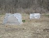 We have a break in the weather. After a morning low in the low 20's,it got up to about 60. All of the hoop houses are now up, 6 for Atlantic Giants, 1 for watermelons. Tomorrow we spread amendments and finish burning off the remaining vines and weeds. I had to pull the shells of the watermelon seedlings. Next year I will file them better and soak them before putting them in the pots.