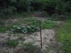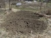 Start of the bushel gourd patch. It is at the bottom of a slope, and has accumulated soil washed down on it for years. This hasn't been plowed up for the 32 years we have owned the acreage, and it may have been in grass for decades before that. I first hit the sod with the mini tiller, turn it over with the fork, and till it again. I put 1 cubic foot of potting soil at each plant site. I got the potting soil on clearance for about $0.75 a bag at the end of 2016. The closest hoop house is in a risky spot. If we get too much rain it could get flooded. It will be our attempt at a blossom down pumpkin.