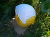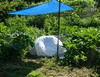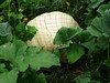 I hope this one grows on my 1047.5. I allowed 600 square feet for the plant and it has nearly taken it all up. Only 3' of vine past it, so I cut it off. Jacob helped me get the fabric and sand under it, I added the chicken wire to keep rabbits away and the white towel. If it starts taking off it will get a tarp. It will have about 75 days growth for a late weigh-off, if we don't get an early frost.